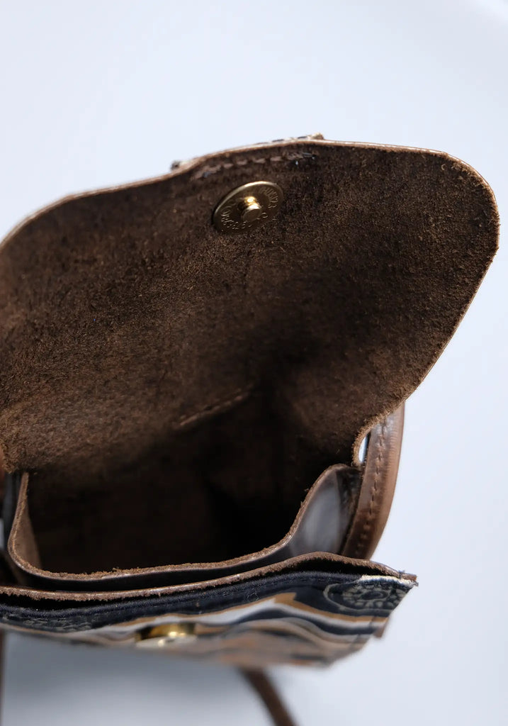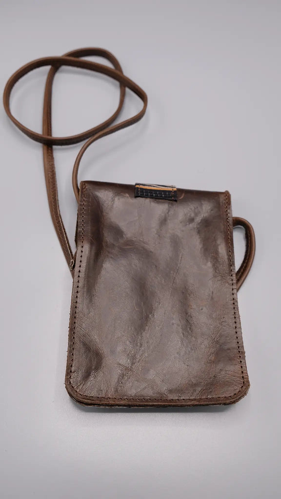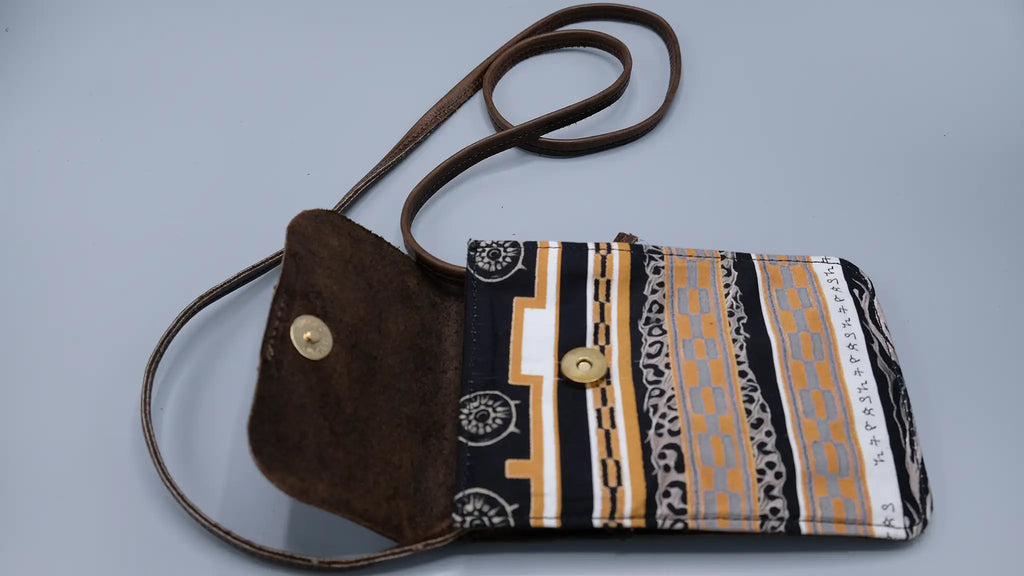 Embrace your daring side with the Denguza crossbody bag. Crafted in Ethiopia, this genuine leather bag embodies the country's southern rich culture, tradition, and heritage through its symbolic artwork. Perfect for toting your cell phone and essentials, it's the perfect addition to any daring and fashionable ensemble!