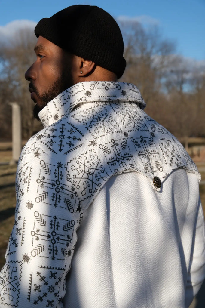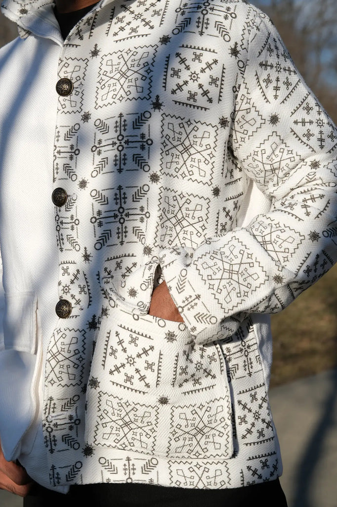 Experience true luxury with our limited edition Alga Werash (First Born) Jacket. Handmade in Ethiopia by DolMel, this jacket is a statement piece that exudes class and chic. Made with handwoven cotton and reactive printing, it features a traditional tattoo design - truly one of a kind. Elevate your style and be truly royalty with the jacket of the year.