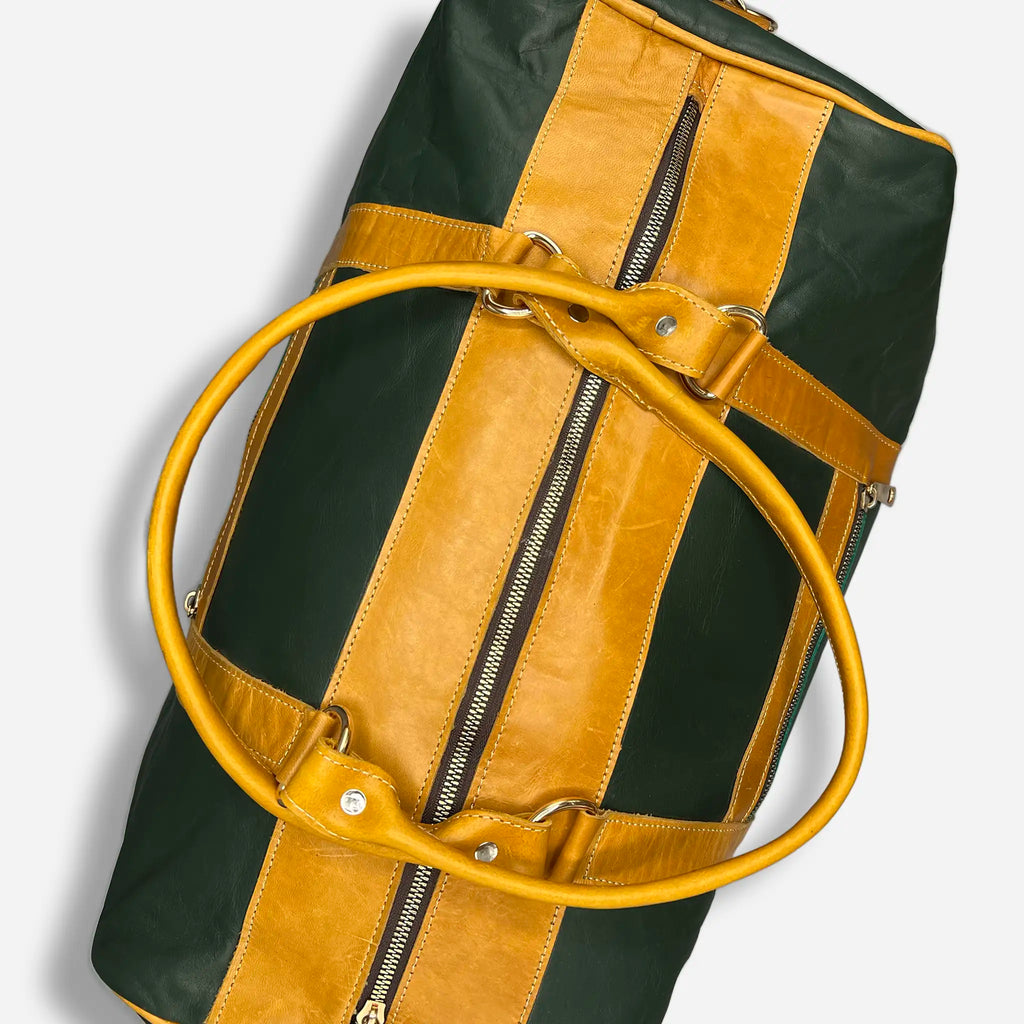 The Green Grace Leather Weekender Duffel Bag is the perfect choice for the modern traveler. Crafted with genuine Ethiopian leather and two-tone accents, this unique bag is stylish, ethical, and guaranteed to turn heads. Carry your world with Green Grace.