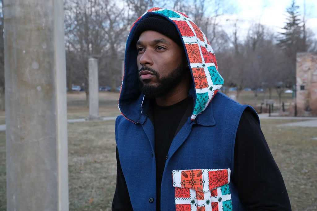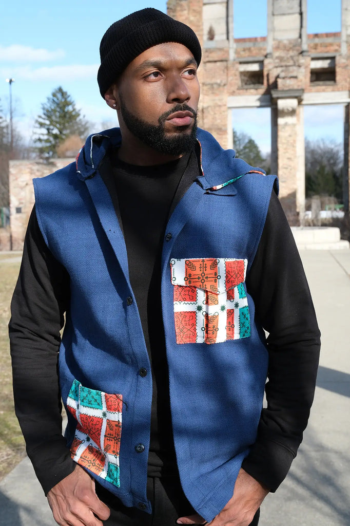 Embody audaciousness and elegance with the limited edition Leûl Denim Hoodie Vest. Created in Ethiopia using hand-woven cotton, this exclusive vest boasts a customary tattoo motif, rendering it a distinctive masterpiece. Through reactive printing and impeccable craftsmanship by DolMel, this vest is truly unparalleled. Incorporate it into your fashion lineup and dominate the scene.