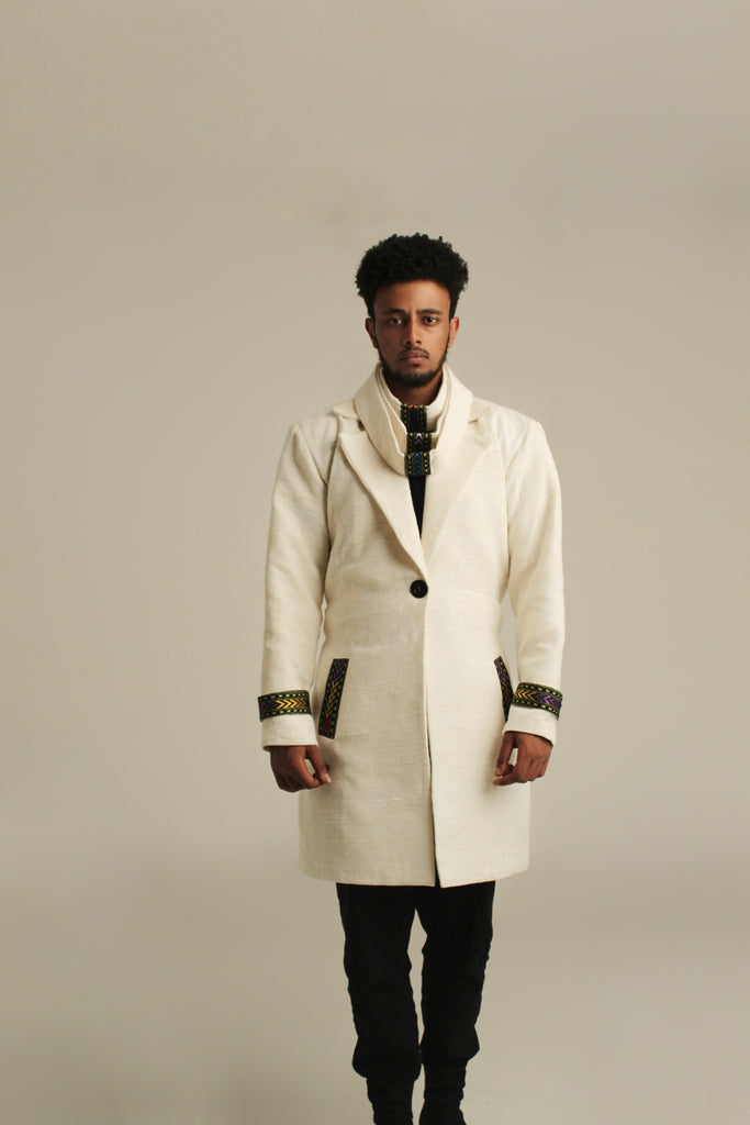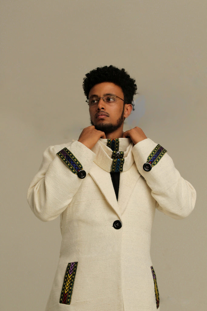 Introducing the Fetal Gabi Coat from Sewasew- crafted with premium, locally-sourced cotton and fused with the vibrant Tilet (pattern). Hand-woven and hand-made, this traditional Ethiopian fabric has a special place in the heart of the country. Keep warm with this exclusive and luxurious coat.