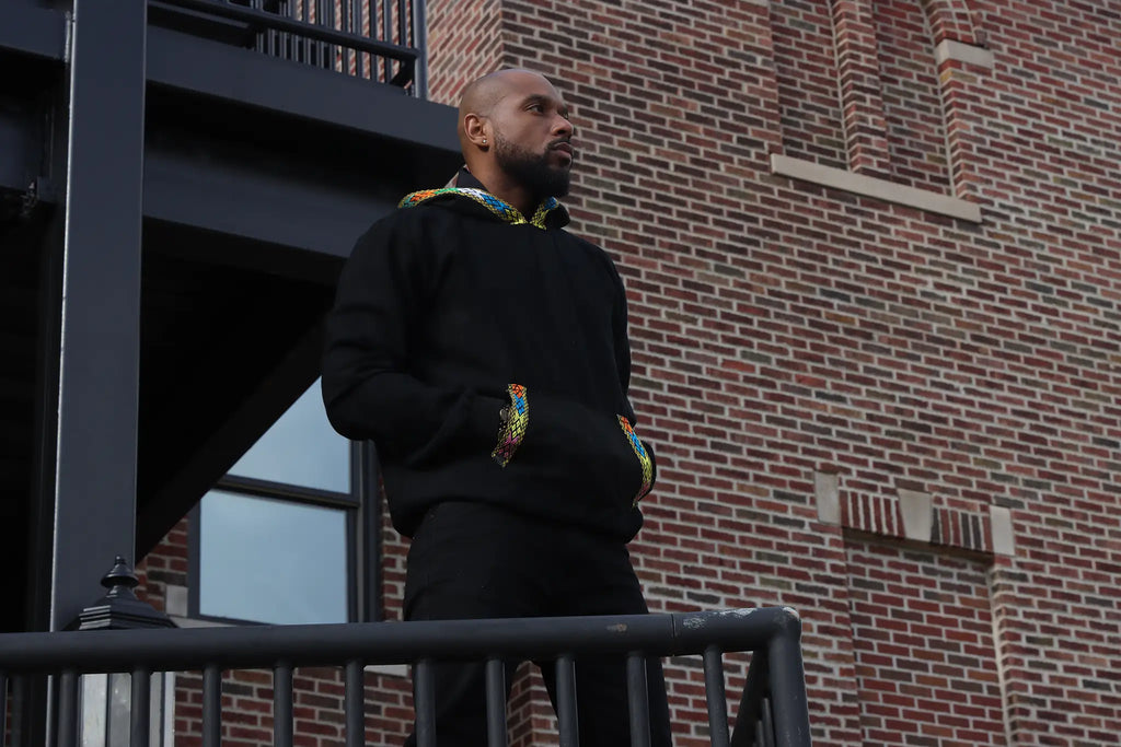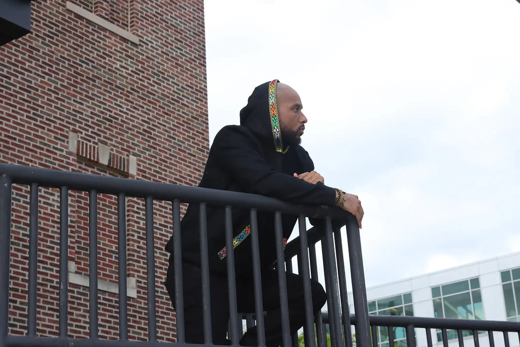 Handwoven Gojam Azen (Linen) Hoodie by Sewasew, made with exquisite tilet (patterns) and high quality linen by skilled artisans in Ethiopia. Each piece is unique, showcasing a piece of history and offering warmth and style. Stand out with this one-of-a-kind, handmade hoodie. Elevate your wardrobe with this exclusive, wearable art.