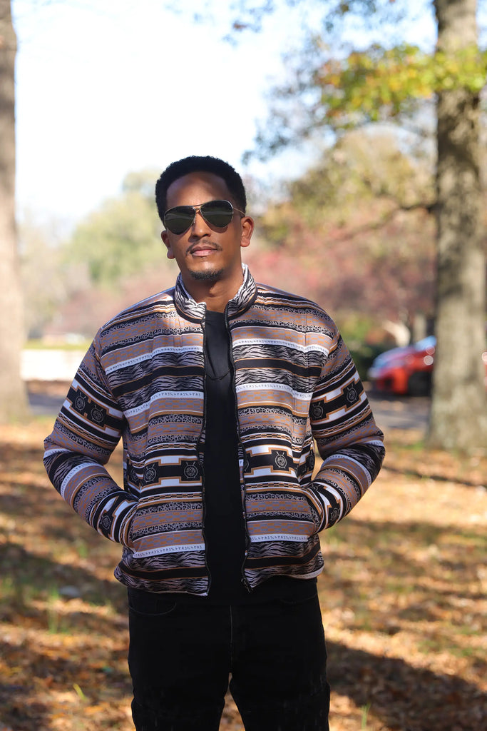 Denguza - an exquisite jacket designed to make a bold statement. This unique and warm puffer is crafted with luxurious fabrics and intricately detailed with patterns from the rich cultures of Southern Ethiopia, ensuring comfort, quality and purpose. Enjoy a timeless look with unparalleled warmth and style.